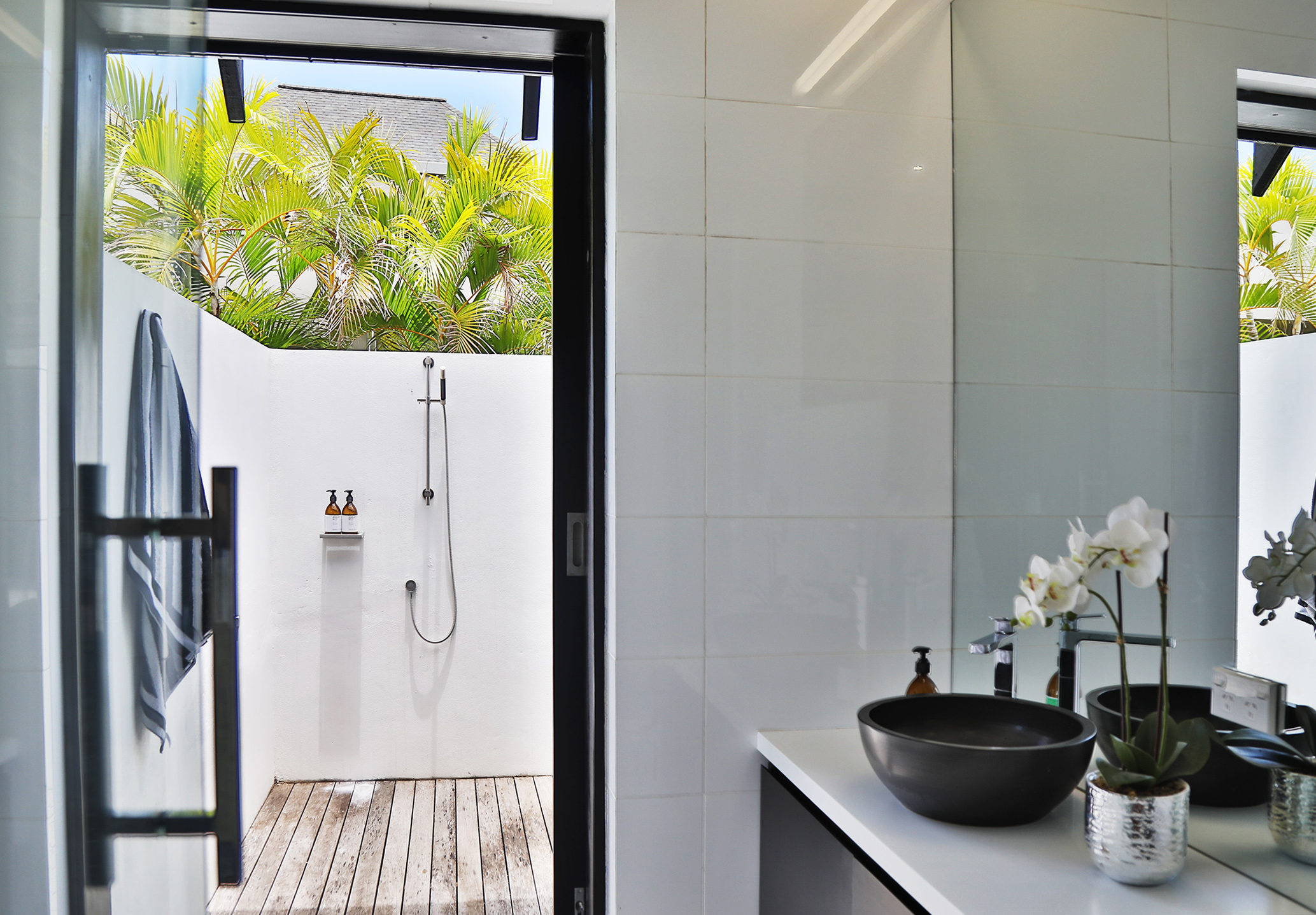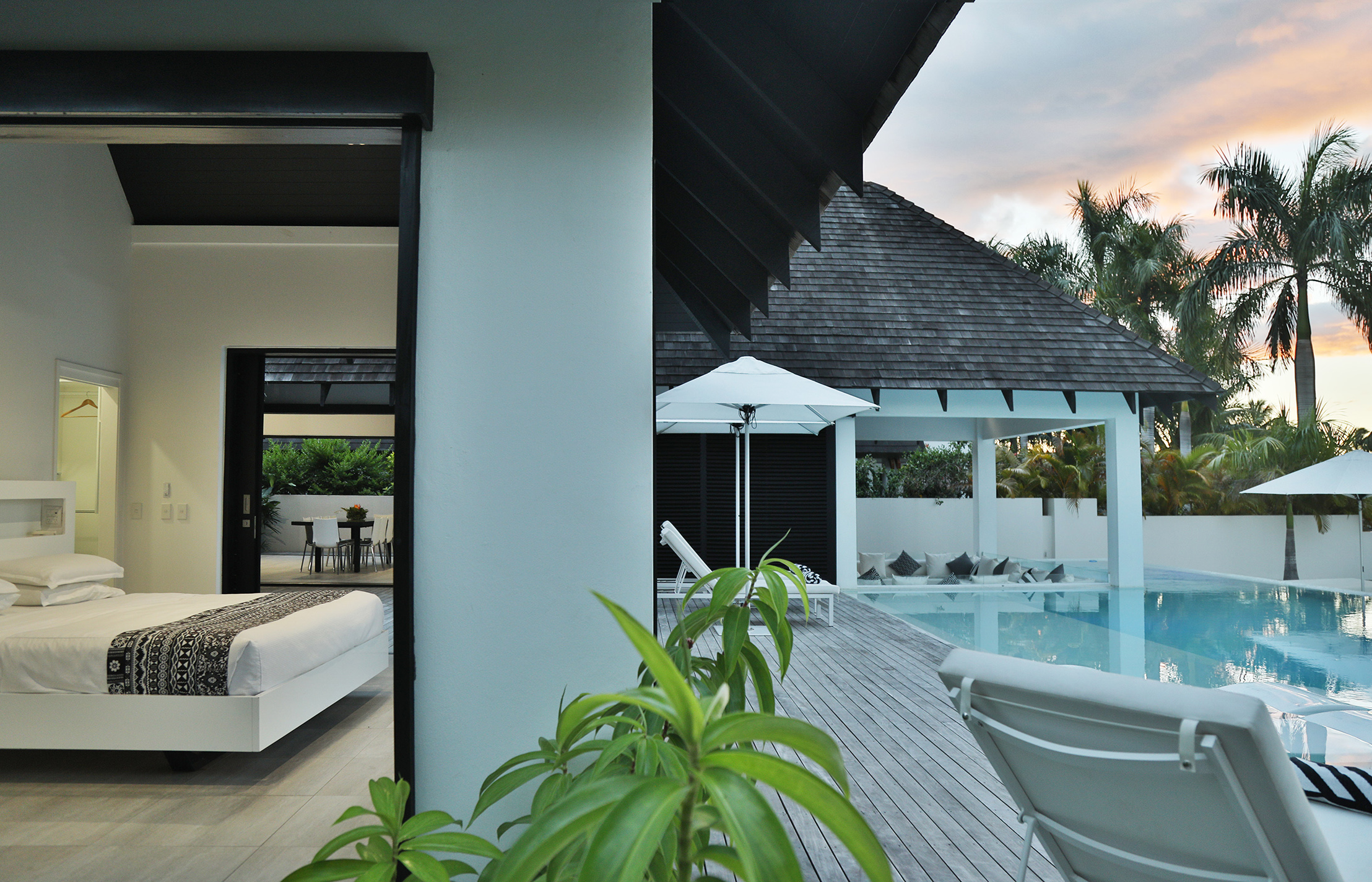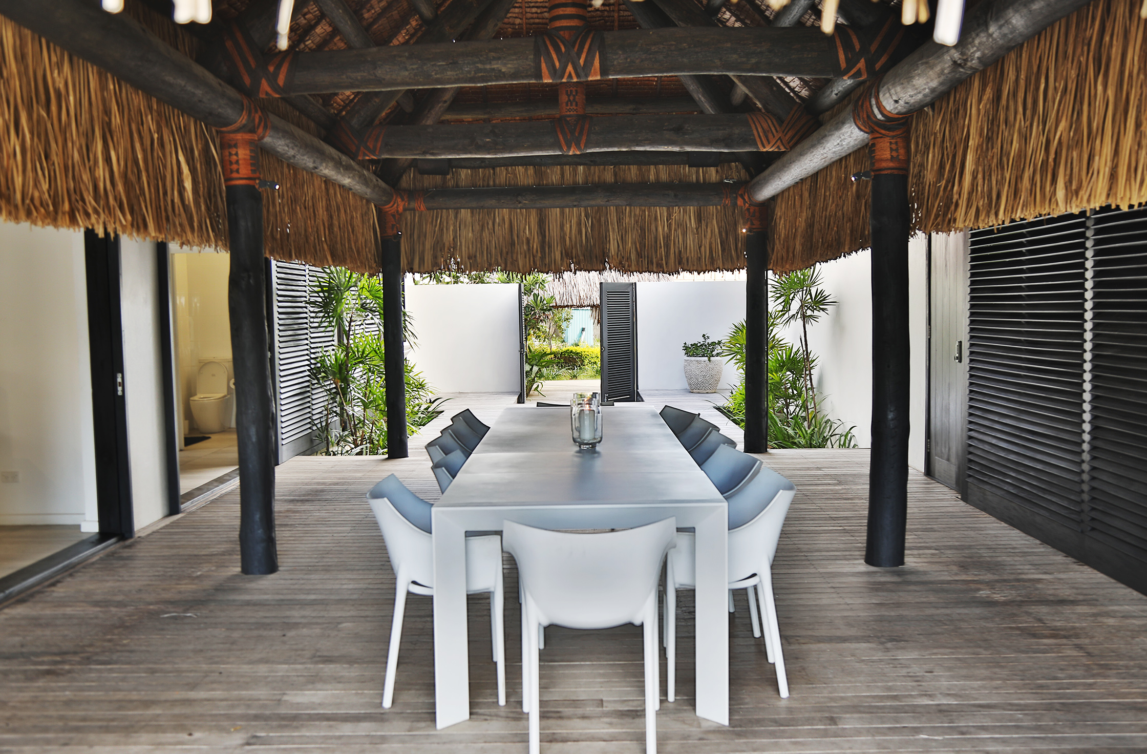 The large wooden sliding side-doors that recess to create a stunning indoor outdoor flow onto the deck and pool area are a special feature that confirm that this impressive home has been designed to embrace living in paradise.